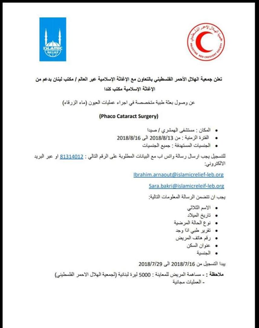 وكالة القدس للأنباء بعثة طبية لإجراء عمليات جراحية للعين مجانا في مستشفى الهمشري قريبا