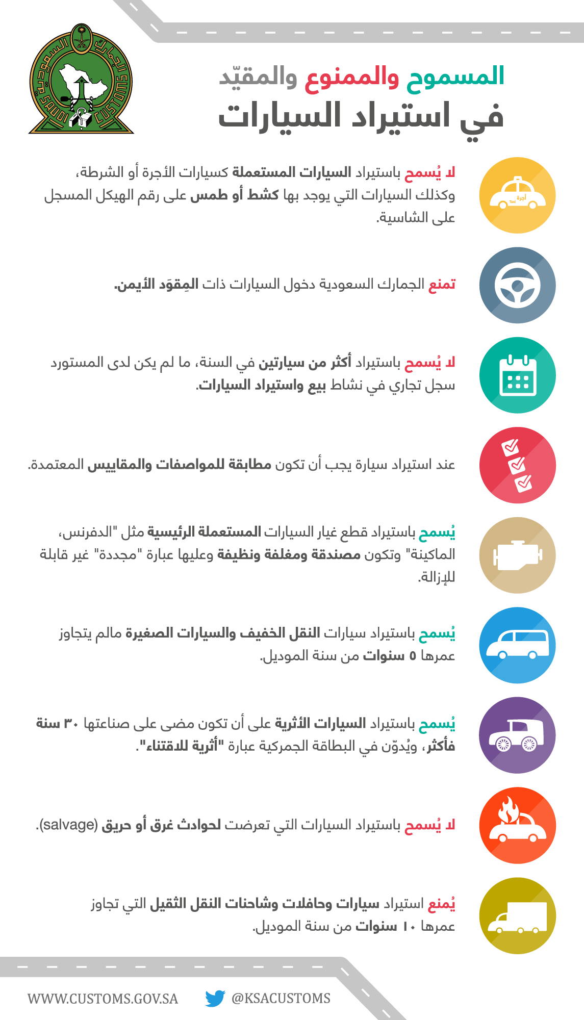 الجمارك السعودية Twitterissa هل تفكر في استيراد سيارة أو ترغب في شراء قطع غيار سيارتك من خارج المملكة تعرف على شروط استيراد السيارات انفوغرافيك Http T Co 8l0nidvjko
